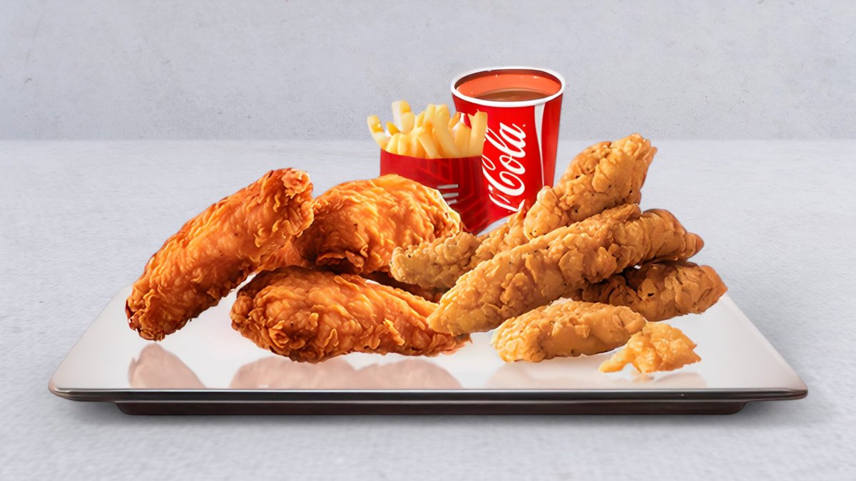 10x tenders, 10x wings, 4x french fries, 4x sauces and 4x canned drinks.