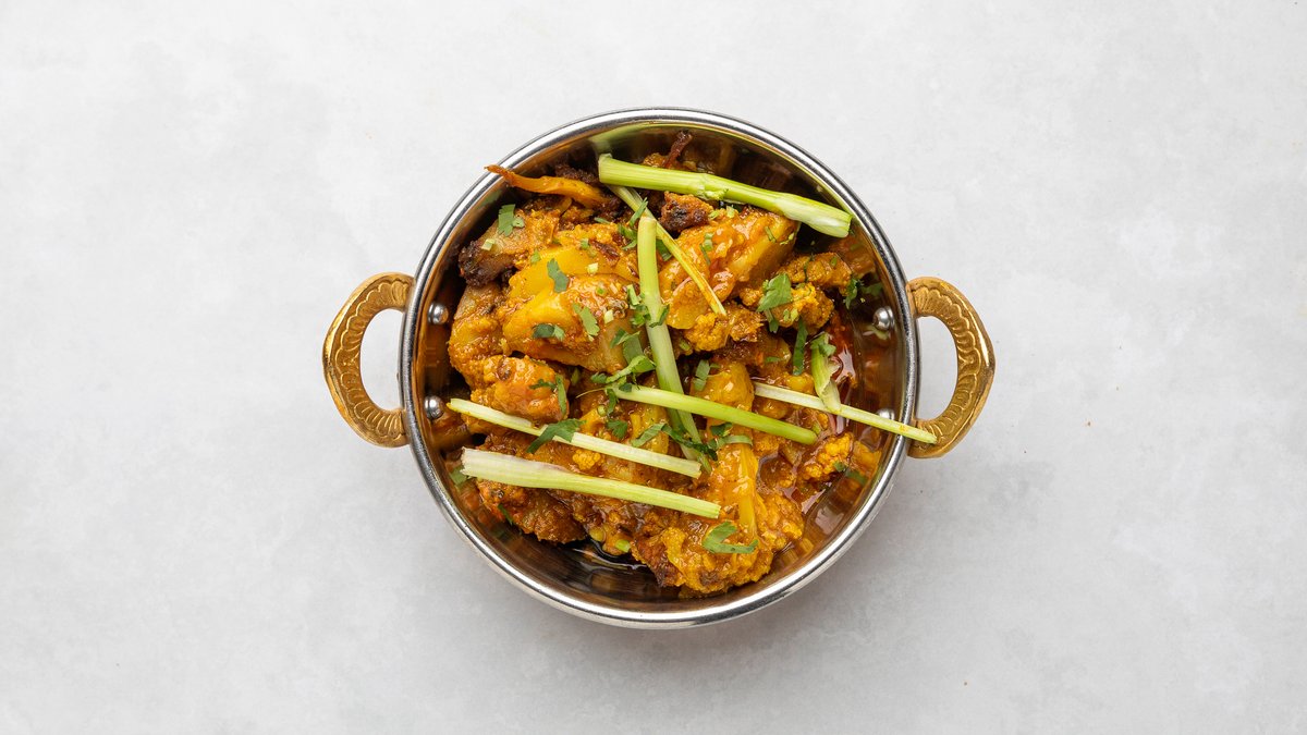 Blomkål och potatisgryta med lök, tomat och indisk kryddor.