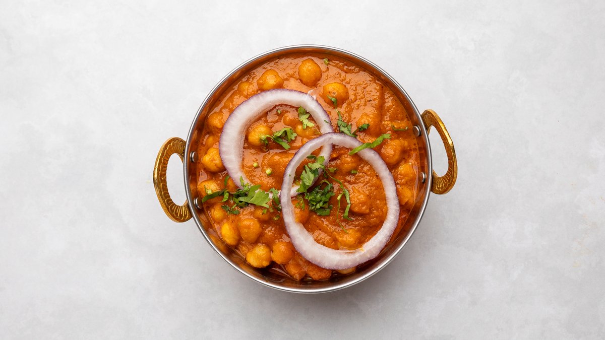 Kikärtsgryta med lök, tomat, ingefära, vitlök och kryddor.
