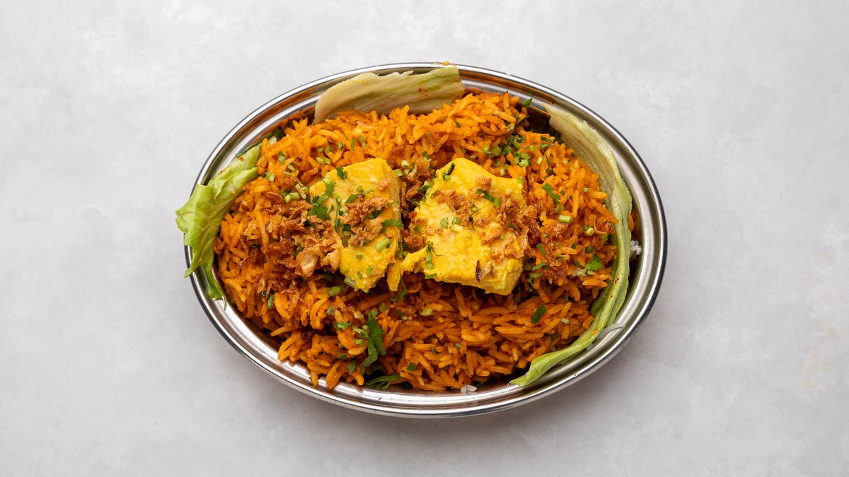 Kycklingfilé tillagad med ingefära, vitlök, lök, tomat, yoghurt,kryddor och blandade med basmatiris.