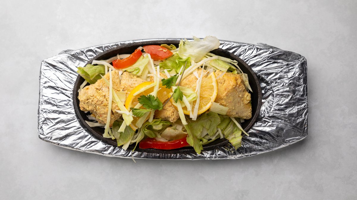 Laxfilé marinerad med citron, yoghurt och tandoori masala grillad i ugn.