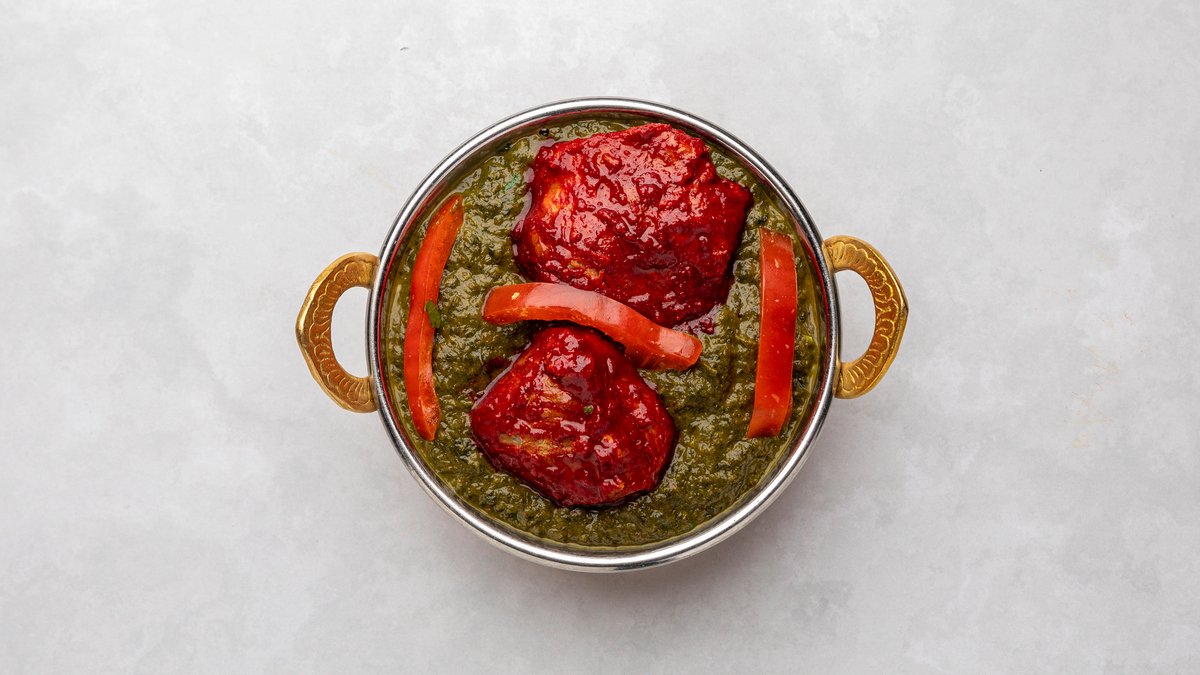 Lammfilé i en sås av spenat, vitlök, ingefära, chili och indiska kryddor.