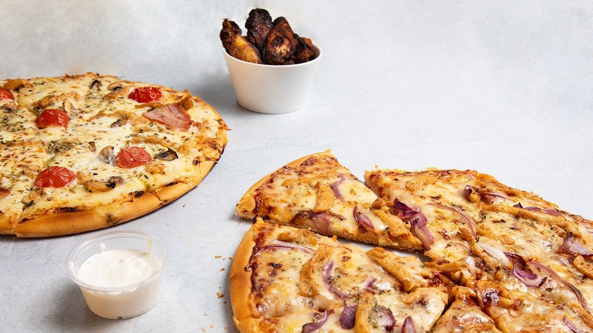 Tomatsås, ost, champinjoner, lök, kyckling och kebabsås.