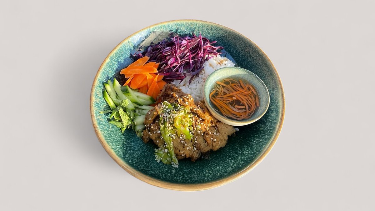 En vietnamesisk risbowl med marinerad fläskkarré, grönsaker och örter. Toppas med ett stekt ägg och serveras med fisksås.