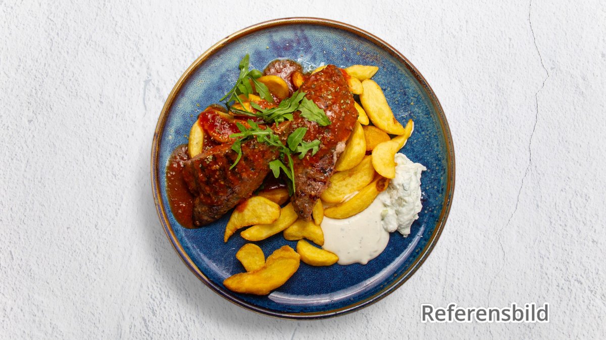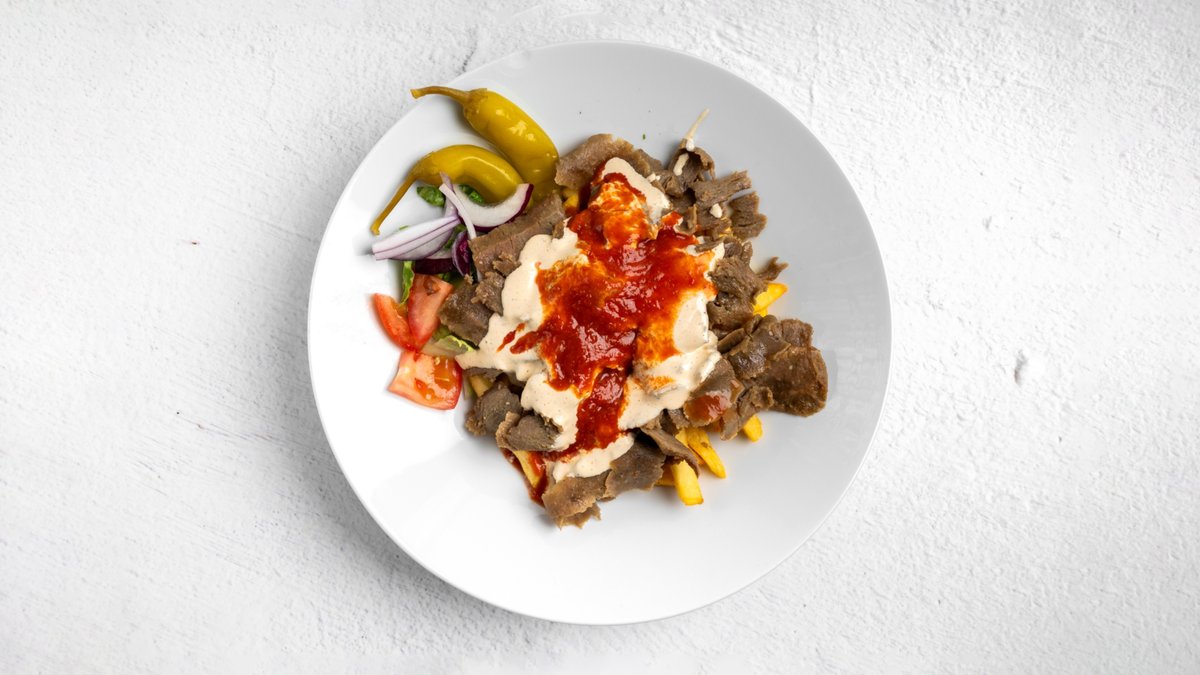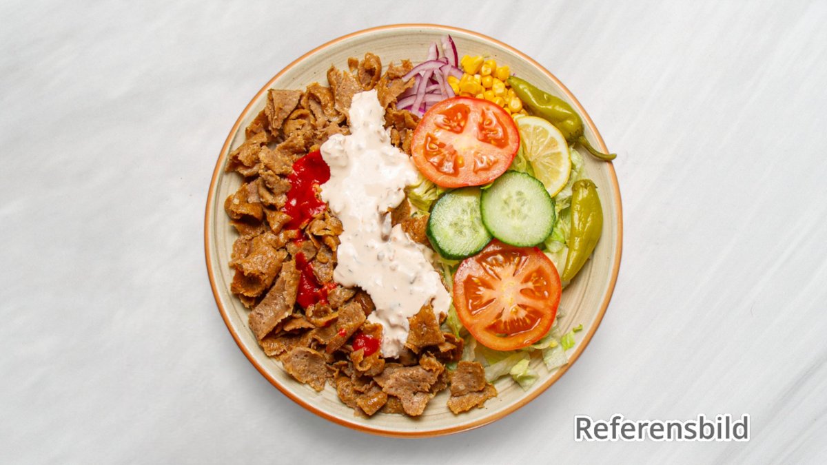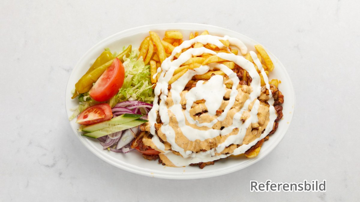 Serveras med ost, skinka och kebabkött.