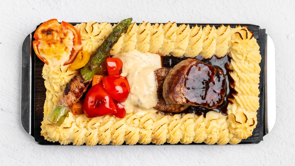 Pizza med oxfile, fläskfile, svamp, sparris och bearnaisesås.