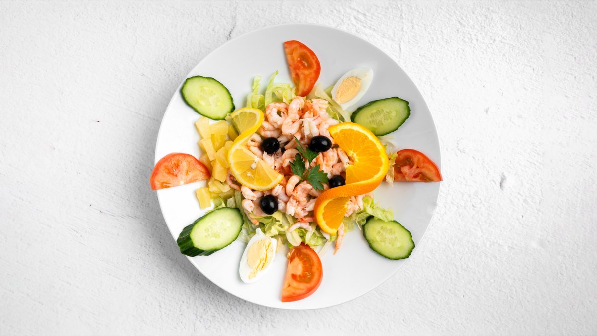 Serveras med skinka, ost, handskalade räkor, avokado och citron.