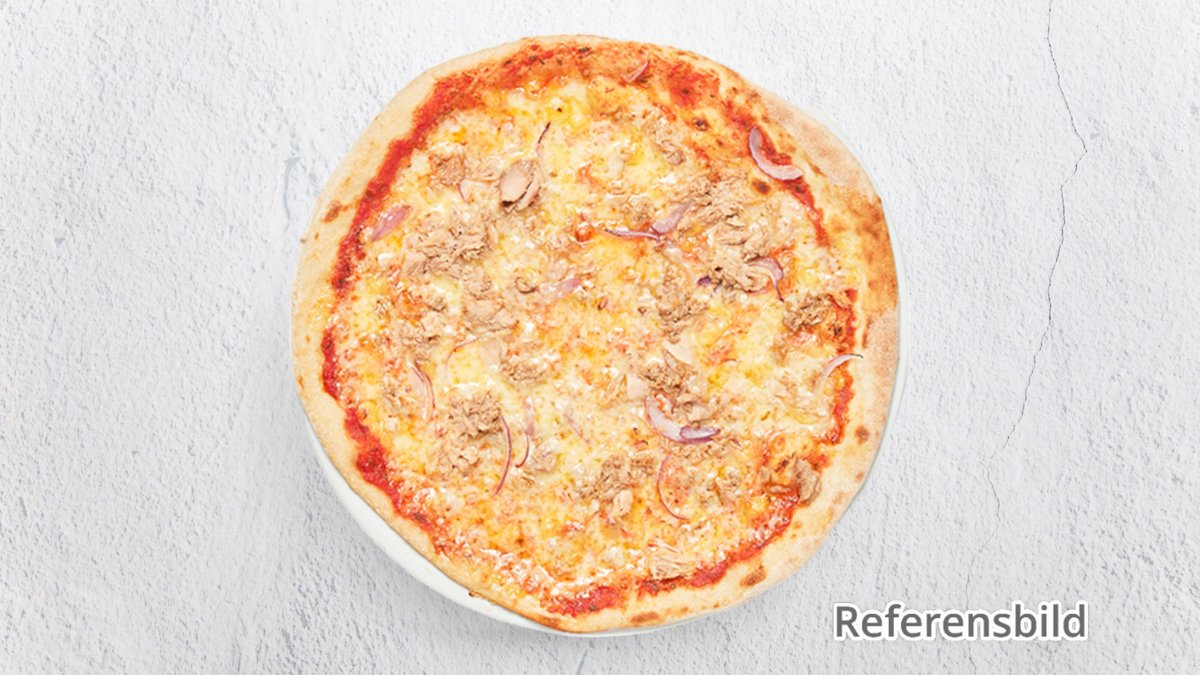 Pizza med tonfisk och lök.