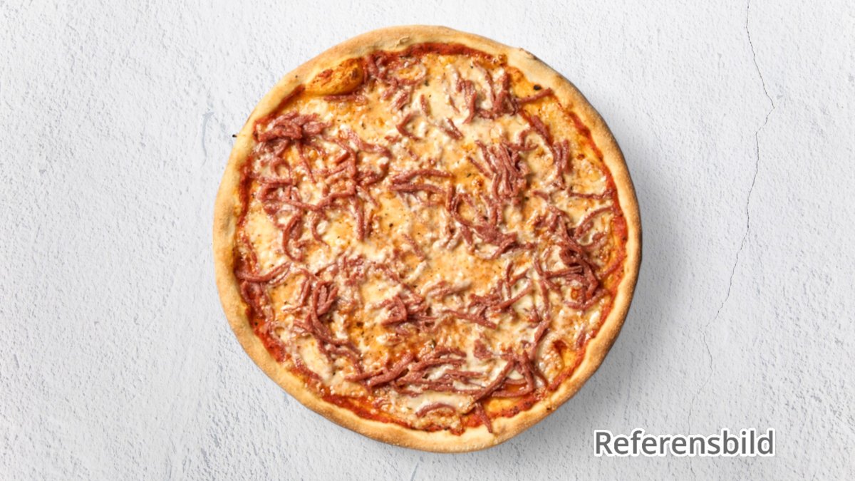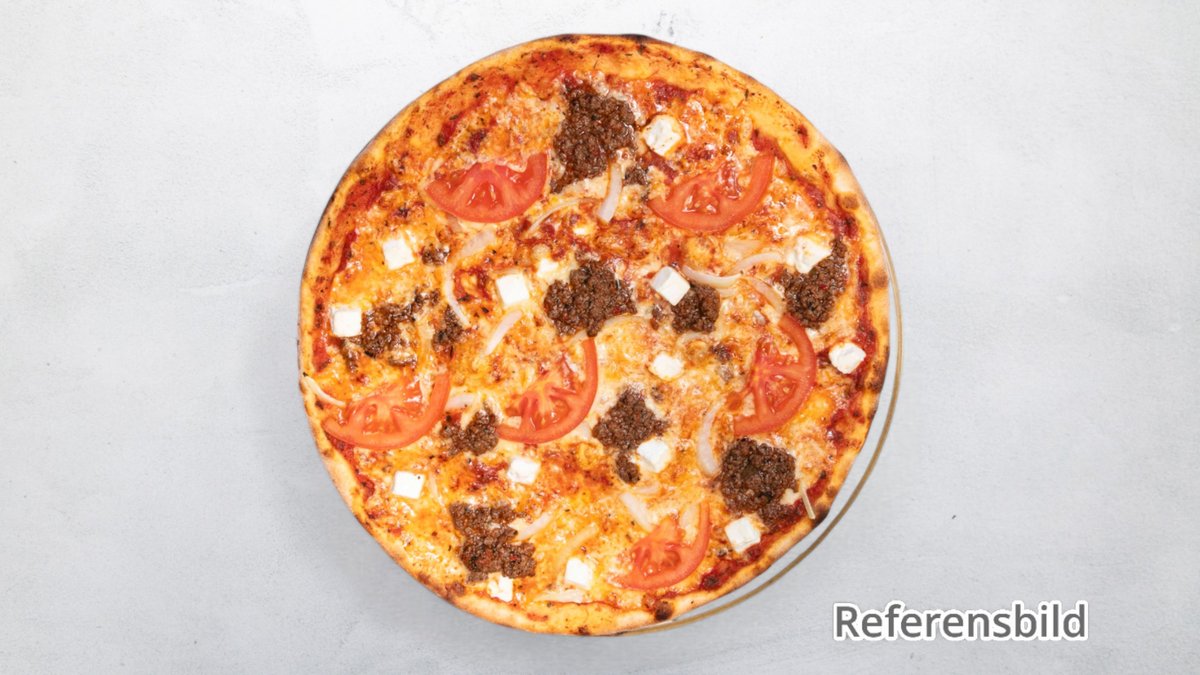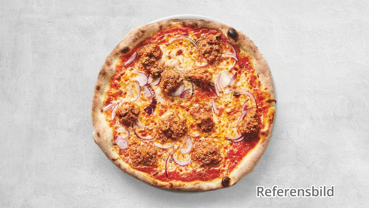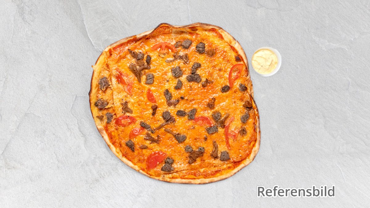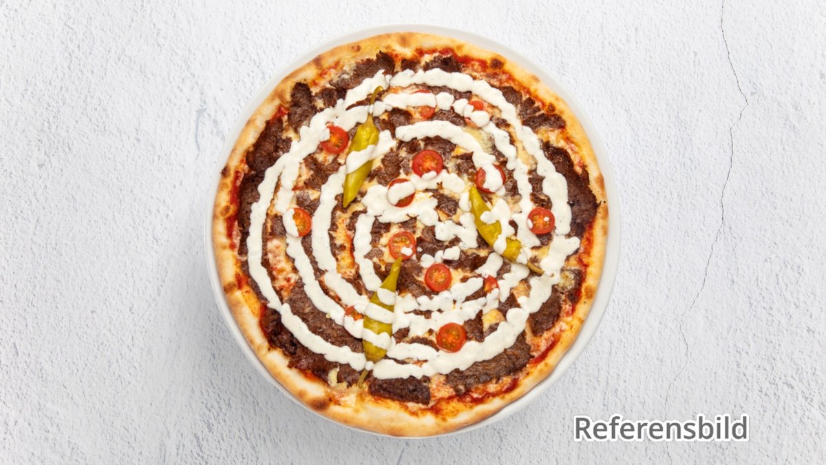 Pizza med stekt köttfärs, tacosås, lök, tacokrydda, jalapeno och valfri kebabsås.