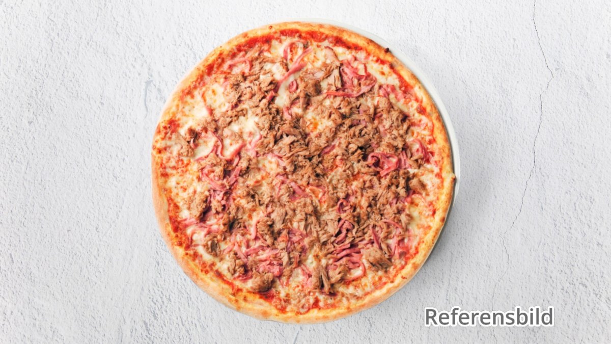 Pizza med tonfisk och skinka.