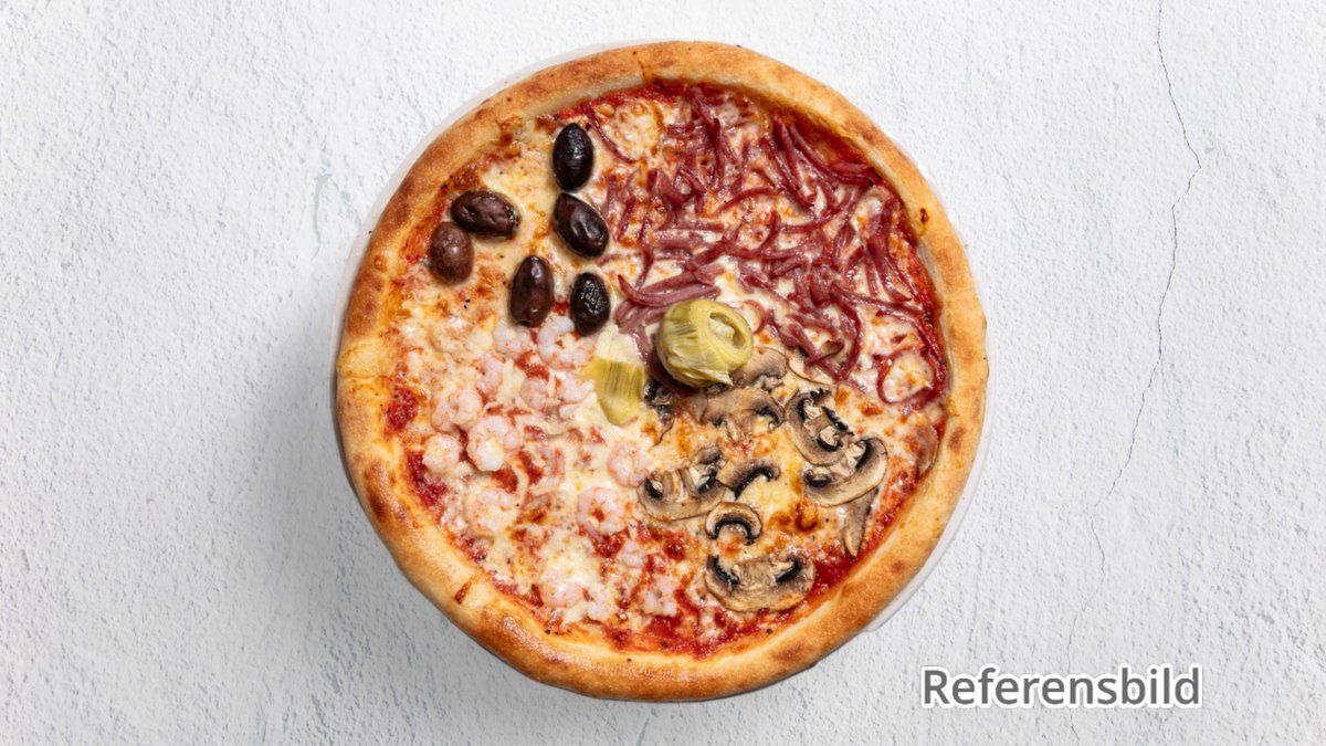 Pizza med skinka, champinjoner, räkor, musslor, kronärtskocka och oliver.