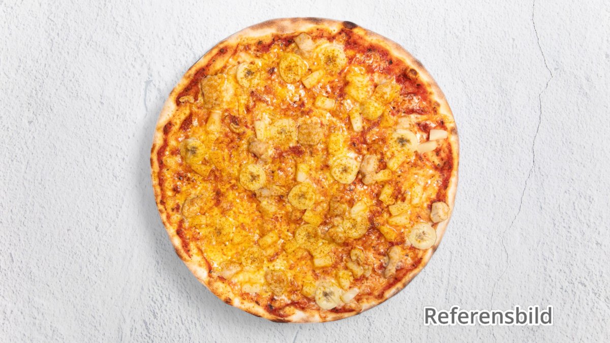 Pizza med skinka, ananas och banan curry.