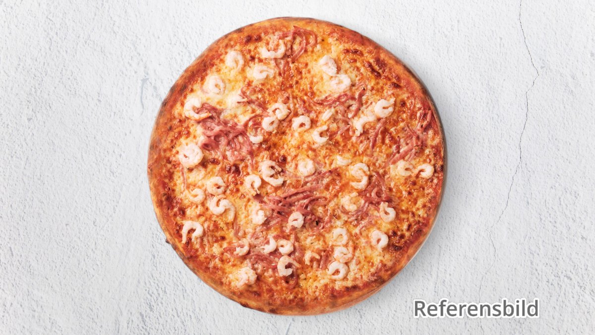 Pizza med skinka och räkor.