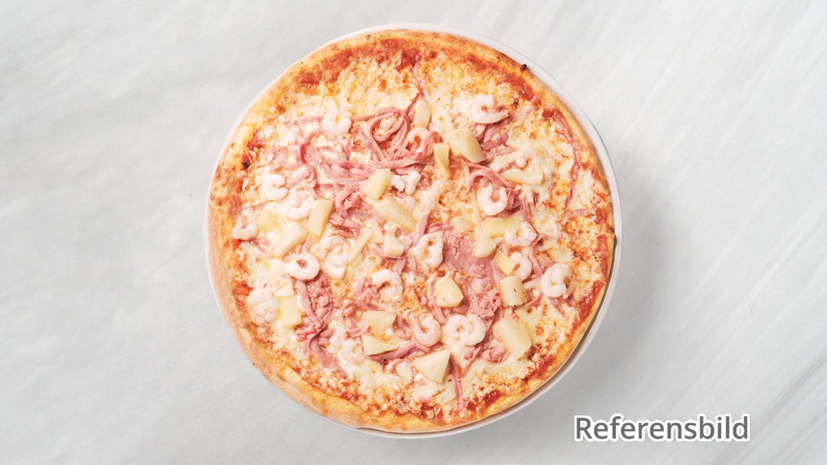 Pizza med skinka, ananas och räkor.