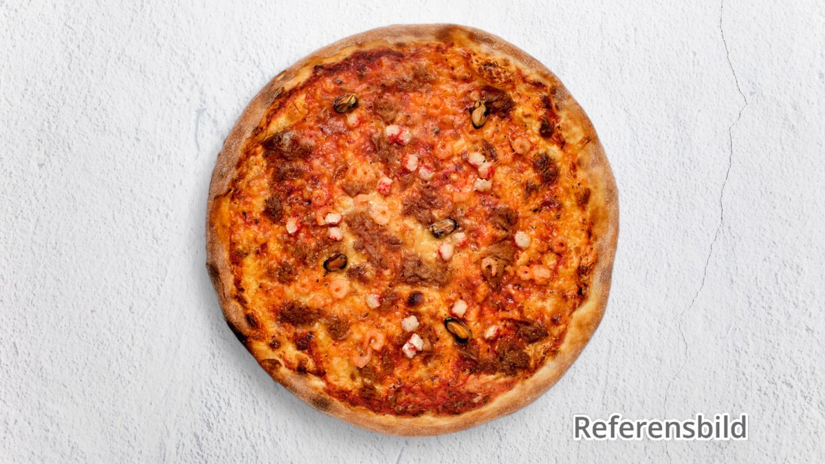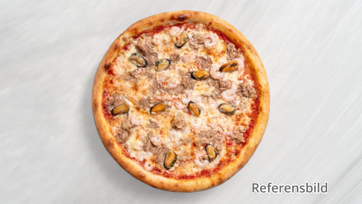 Pizza med räkor, musslor, tonfisk och crabfish.