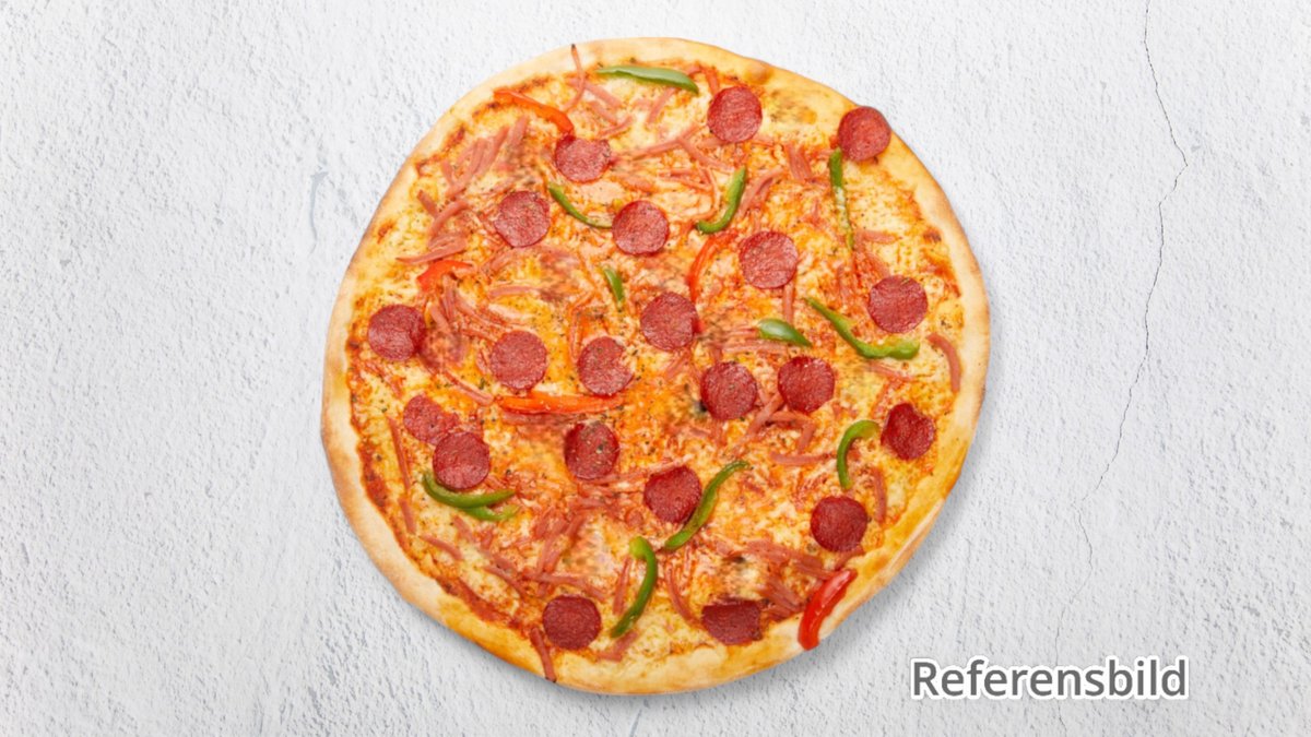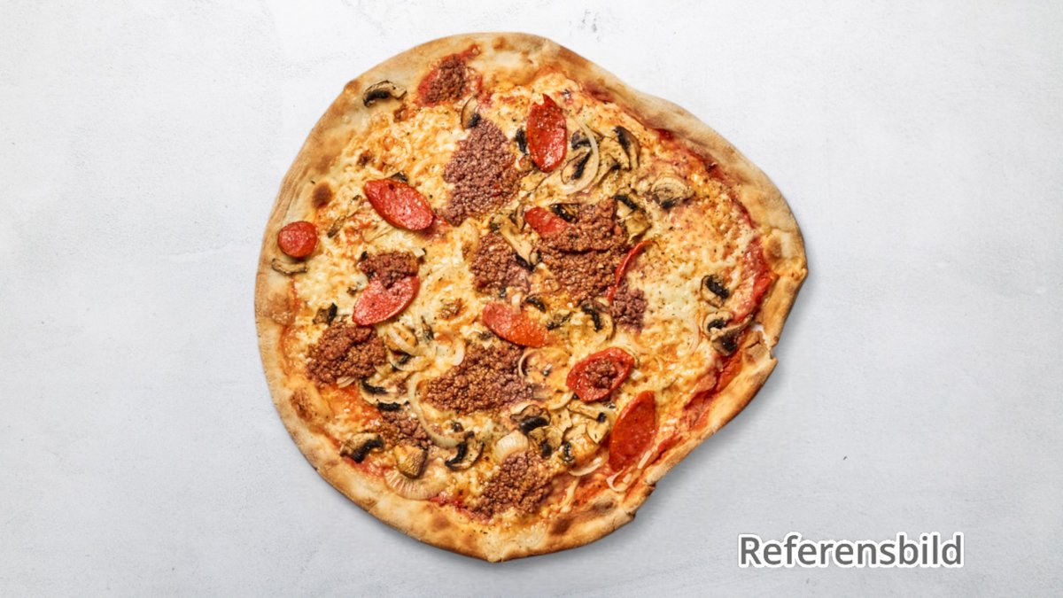 Pizza med skinka, bacon, salami, lök, champinjoner och oliver.