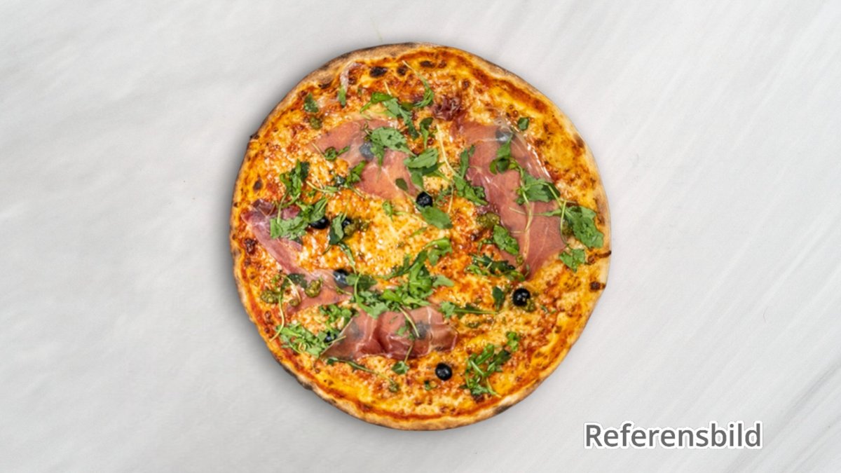 Dubbelinbakad. Pizza med skinka, räkor och champinjoner.