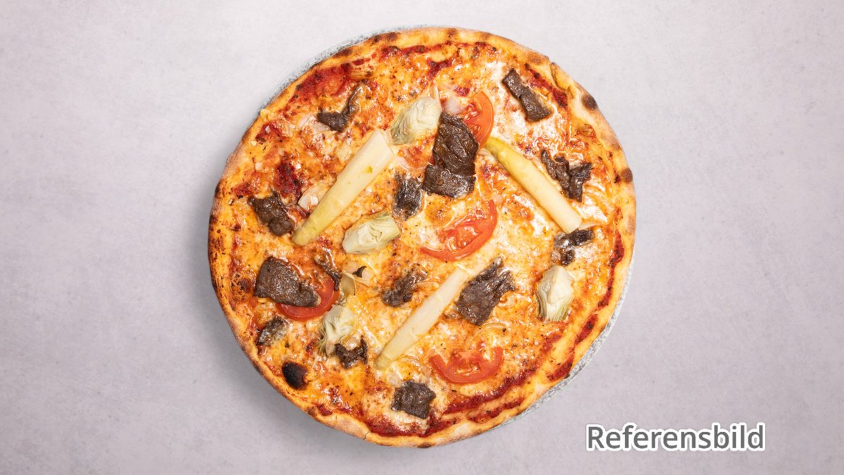 Pizza med champinjoner, lök, tomater, paprika, kronärtskocka, oliver, sparris och ananas.