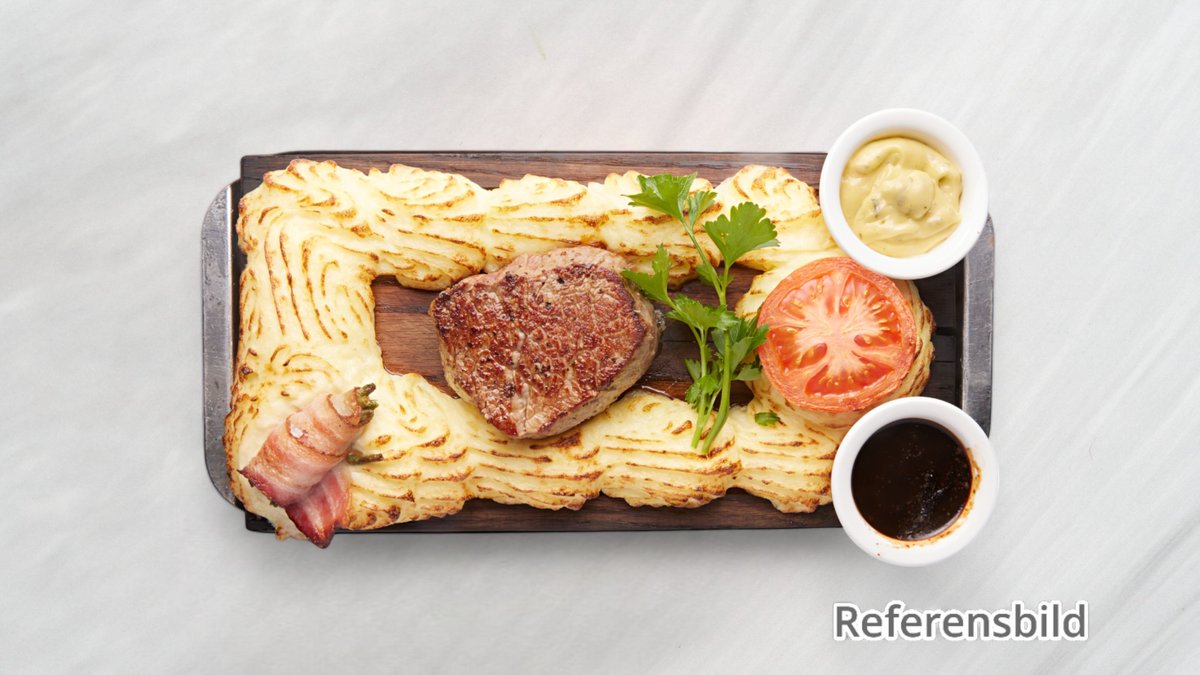 Serveras med oxfile, fläskfile med bearnaisesås och rödvinssky.