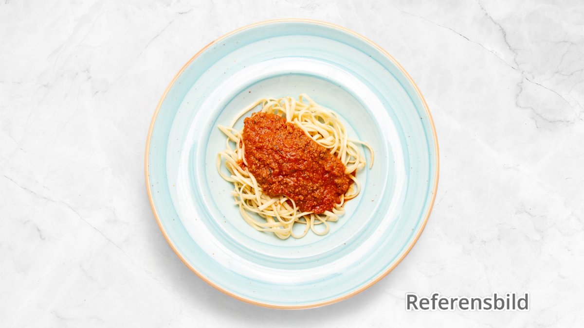 Serveras med tomatsås, ost och skinka.