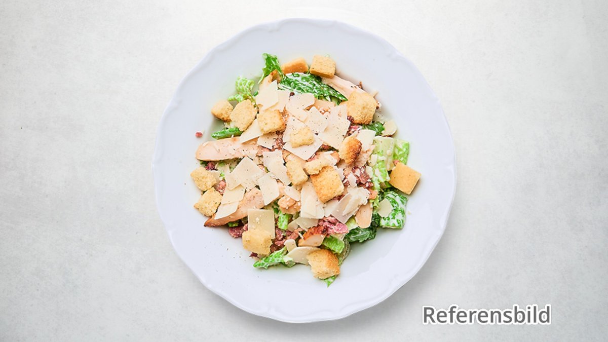 Serveras med romansallad, kyckling, krutonger, caesardressing och bacon.