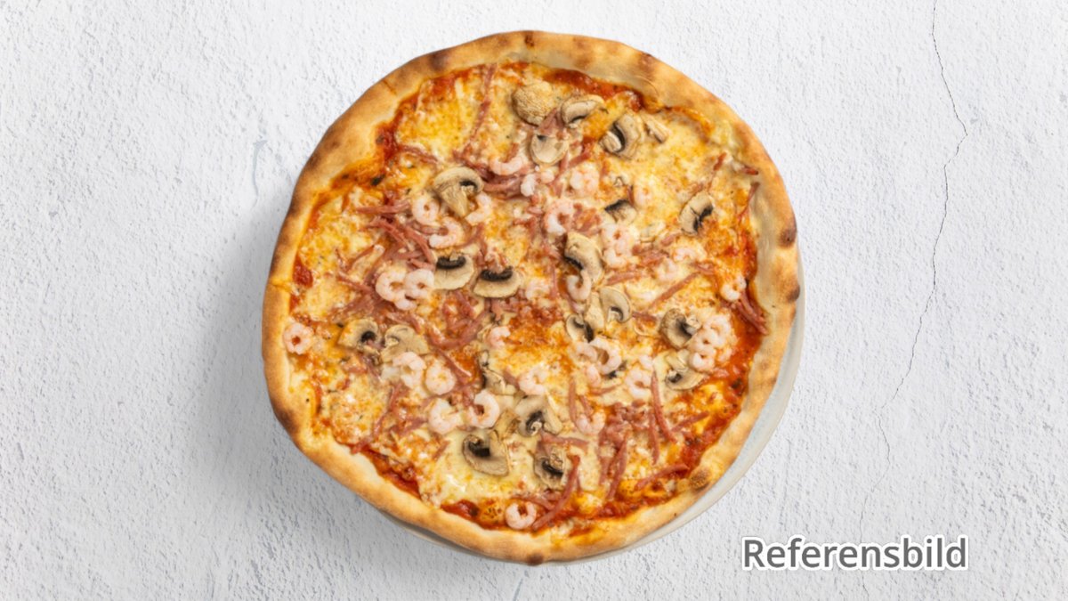Pizza med skinka, räkor och champinjoner.