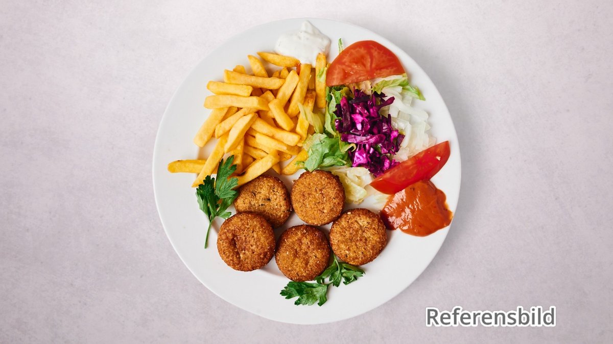 Falafelbollar serverade med pommes och sallad.