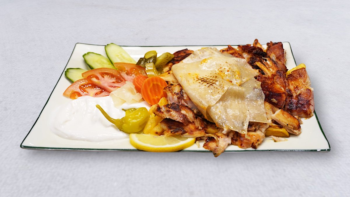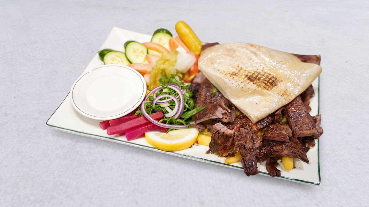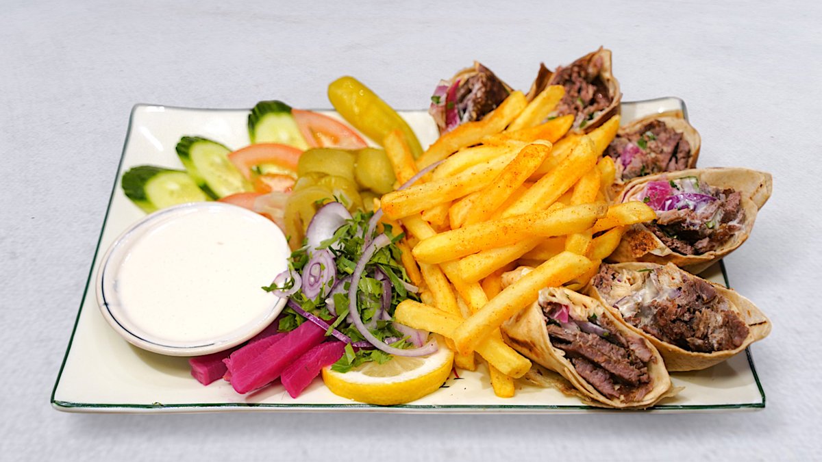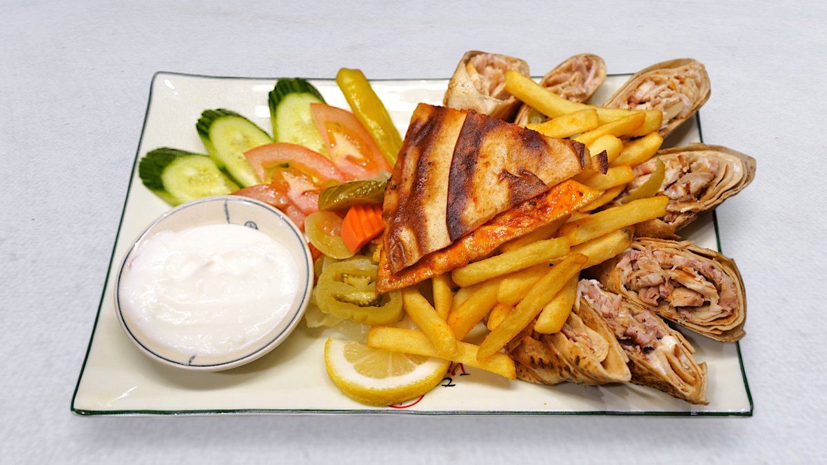 En blandning av kyckling, nötköttshawarma med pommes frites, grönsaker, tahinasås och vitlökssås.