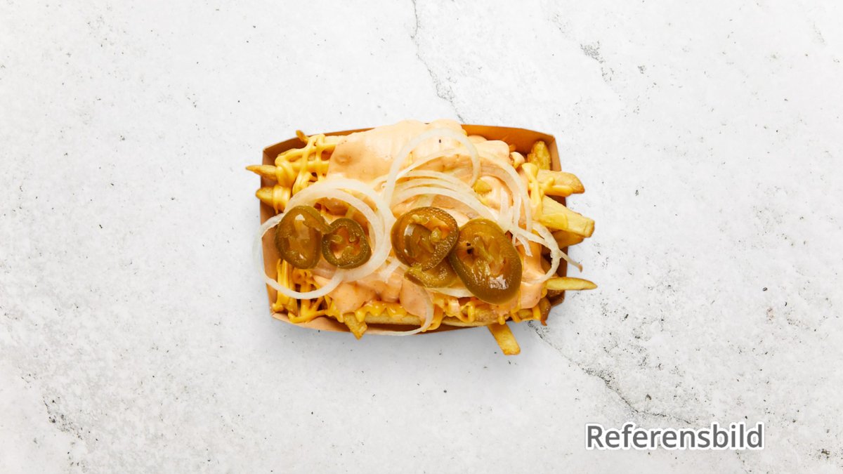 Pommes frites toppade med smält chili cheese sås.