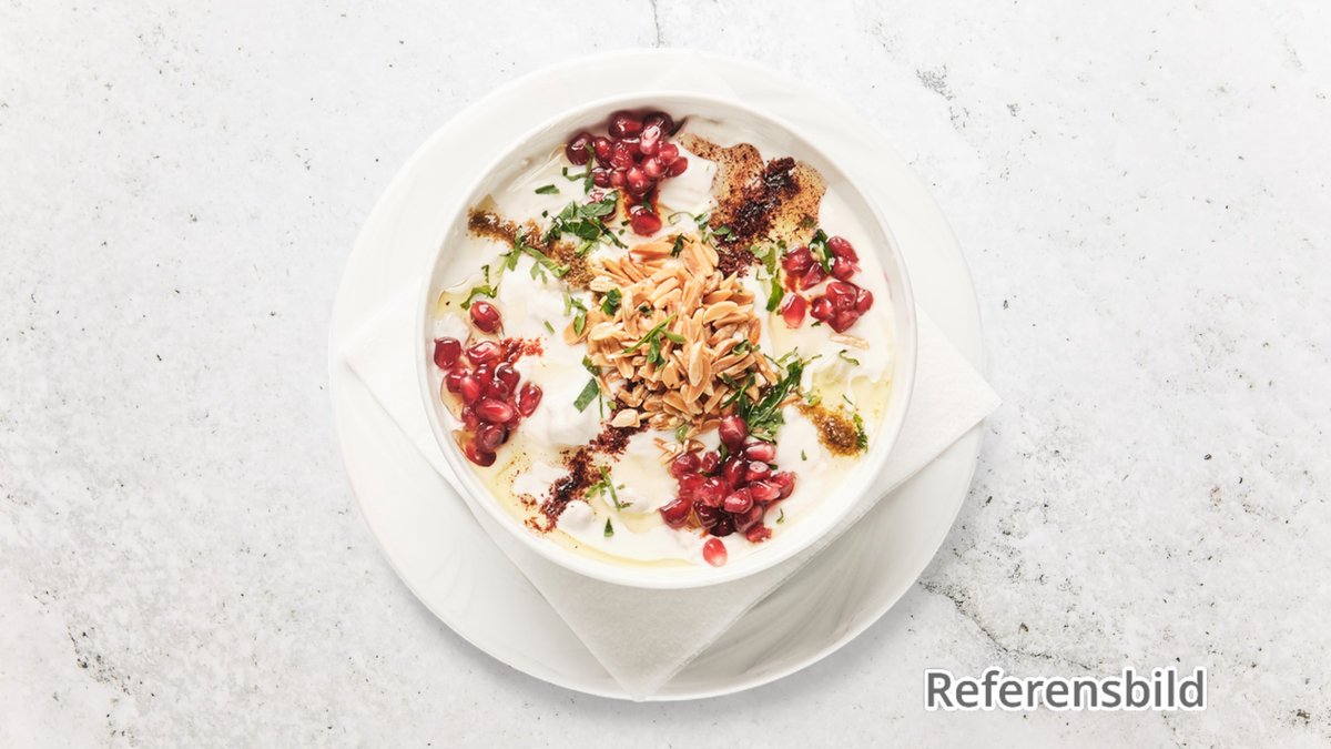 Serveras med bröd, kikärtor och yoghurt. Toppat med smält smör.