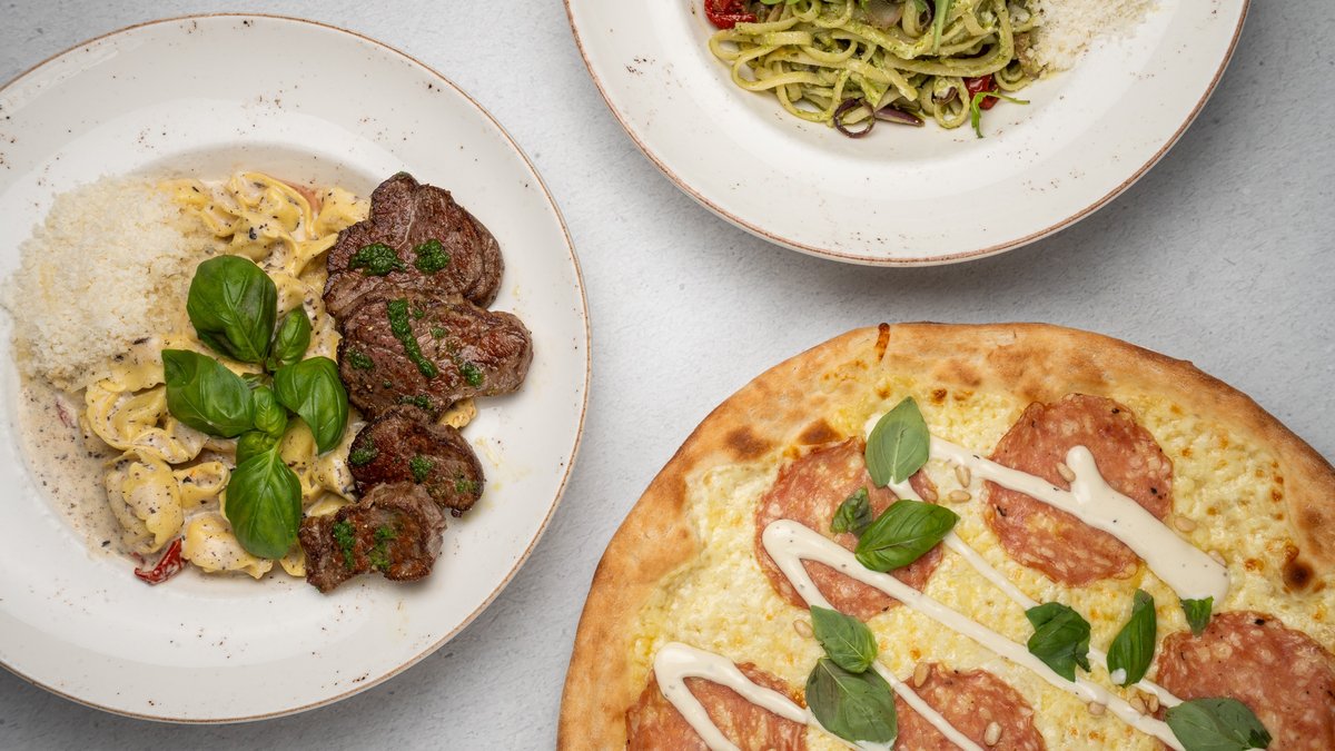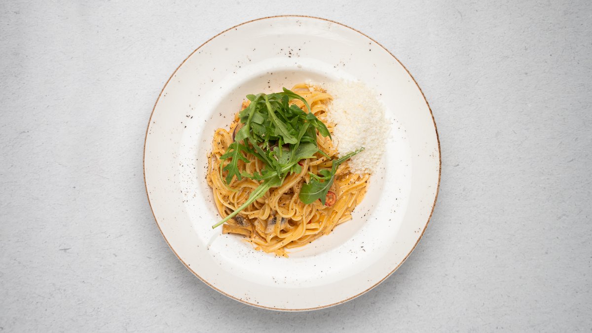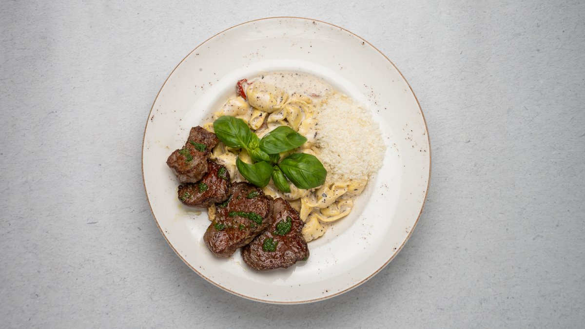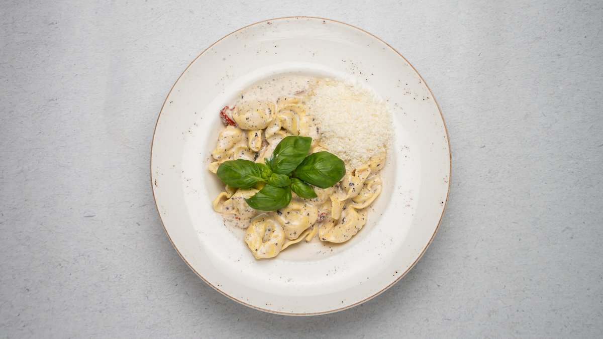 Tortelloni med ricotta-och spenat fyllning, semitorkade tomater och basilika i tryffelsås