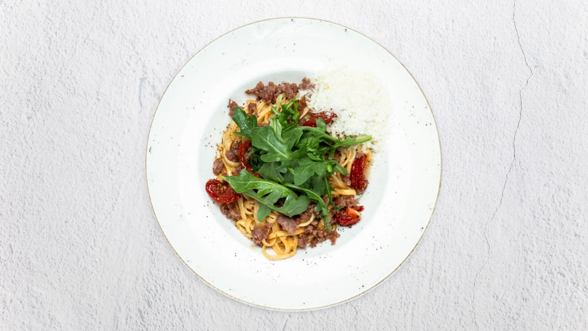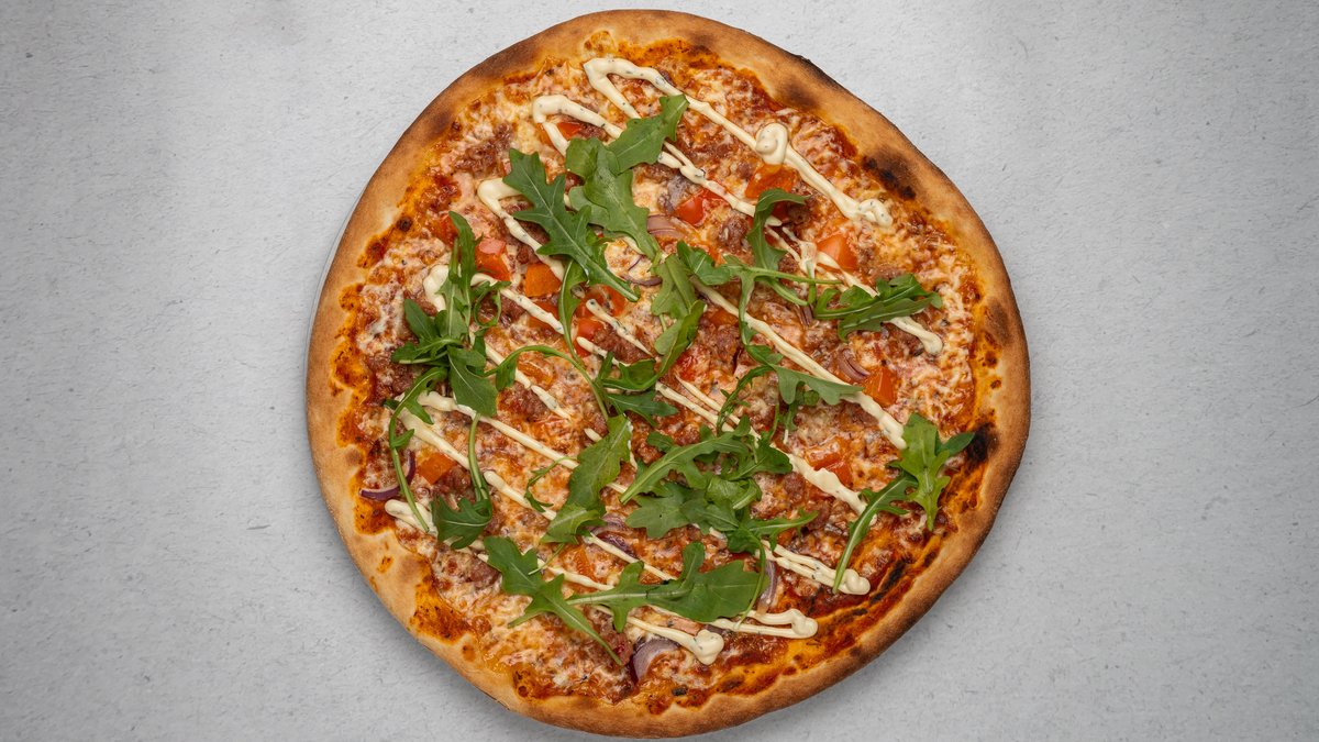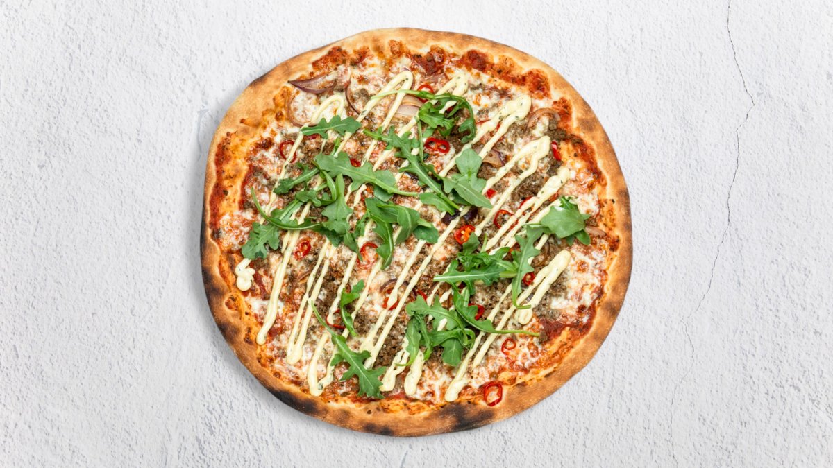 Köttfärs, lök chili, bearnaisesås, mozzarella och ruccola