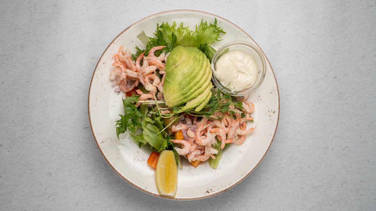Handskalade räkor, grönsaker, avokado, cocktailtomater, aioli och vinegrette