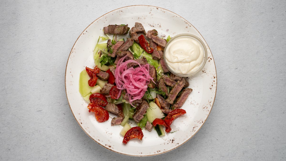 Oxfile, grönsaker, picklad lök, semitorkade tomater och aioli