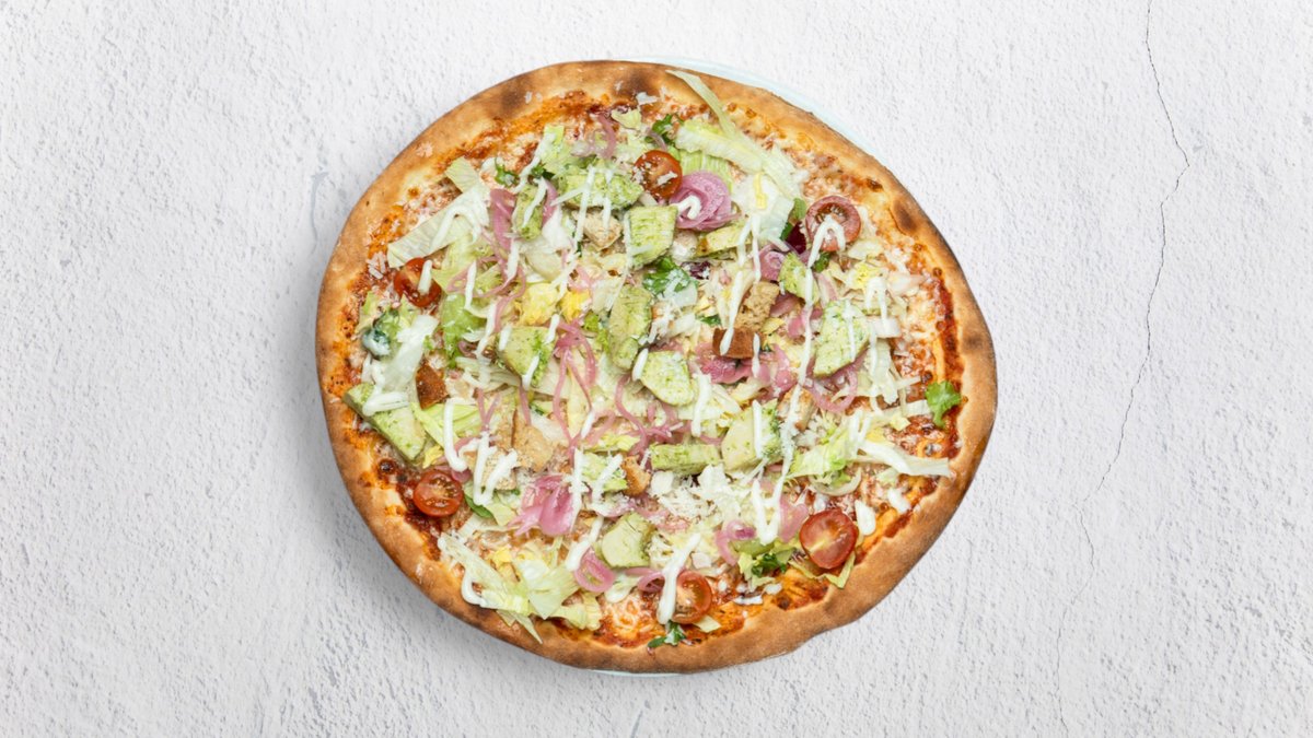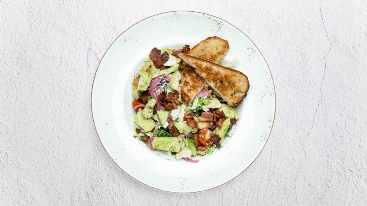 Kyckling, bacon, lök, krutonger, picklad lök och cocktail tomater