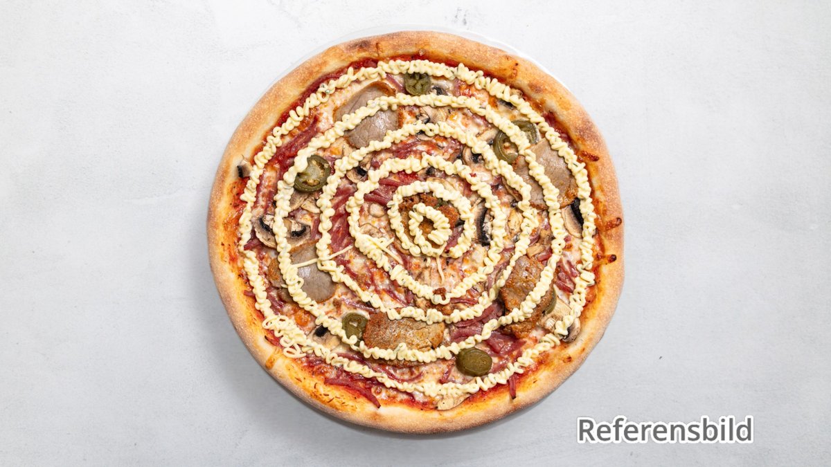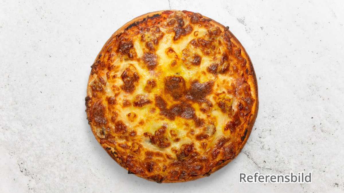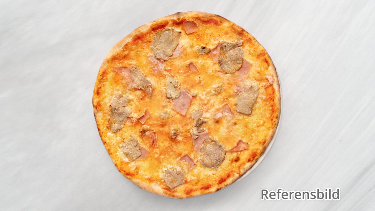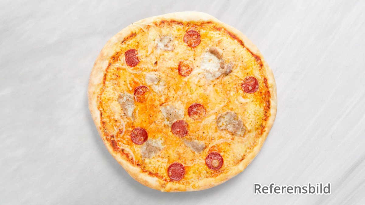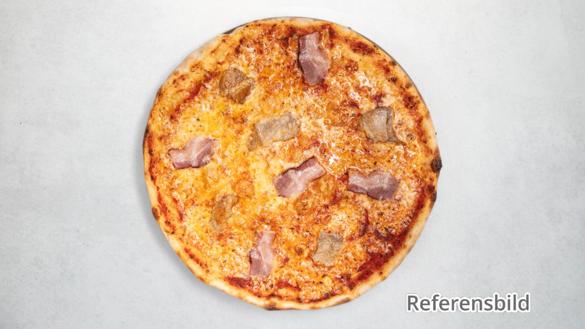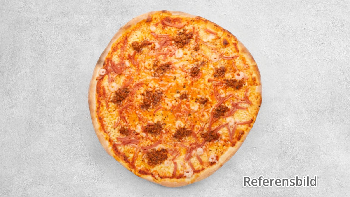 Tomat, ost, skinka, salami, pepperoni, champinjoner, lök, hotsås.