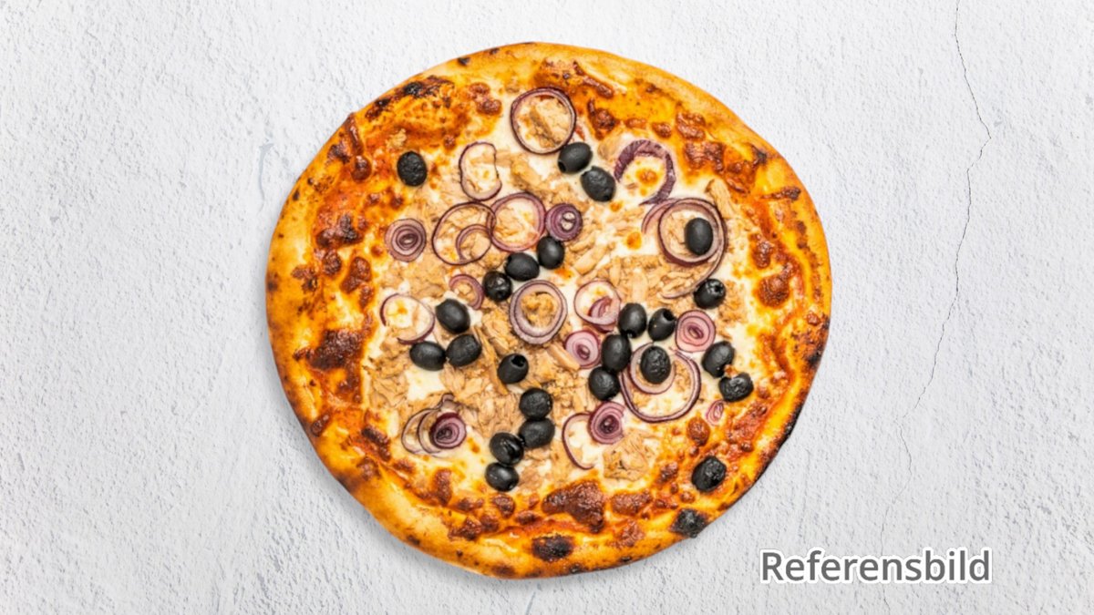 Tomat, ost, tonfisk, champinjoner, ananas, lök, paprika, oliver, tomater.
