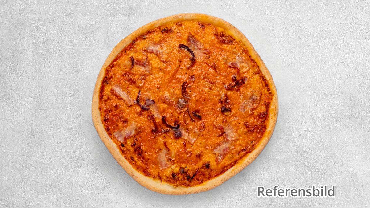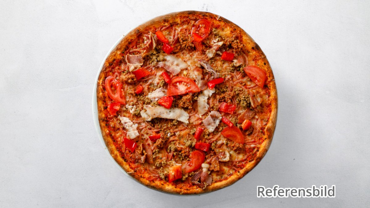 Tomat, ost, skinka, köttfärs, bacon, lök.