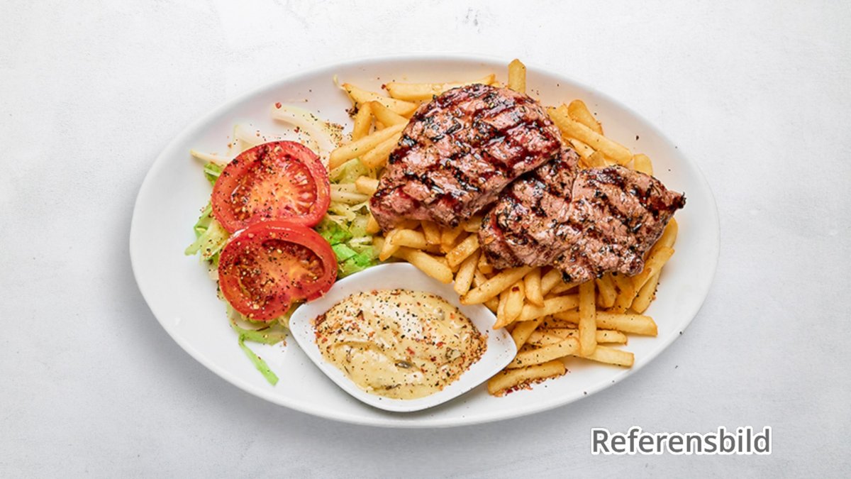 Sallad, stekt paprika, stekt lök, champinjoner, färsk tomat, pommes och persiljesmör eller bearnaisesås.