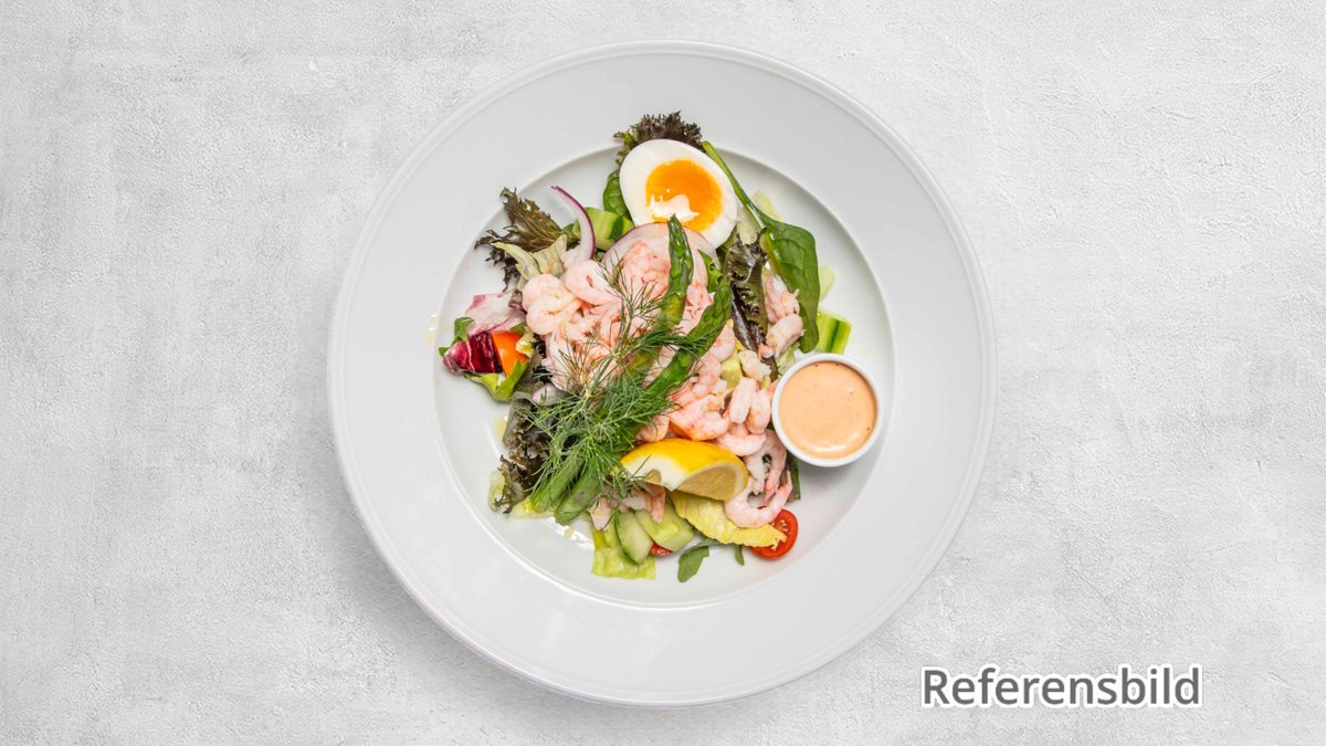 Räkor, isbergssallad, gurka, fetaost, tomat, paprika, oliver, ost, ananas och citron.