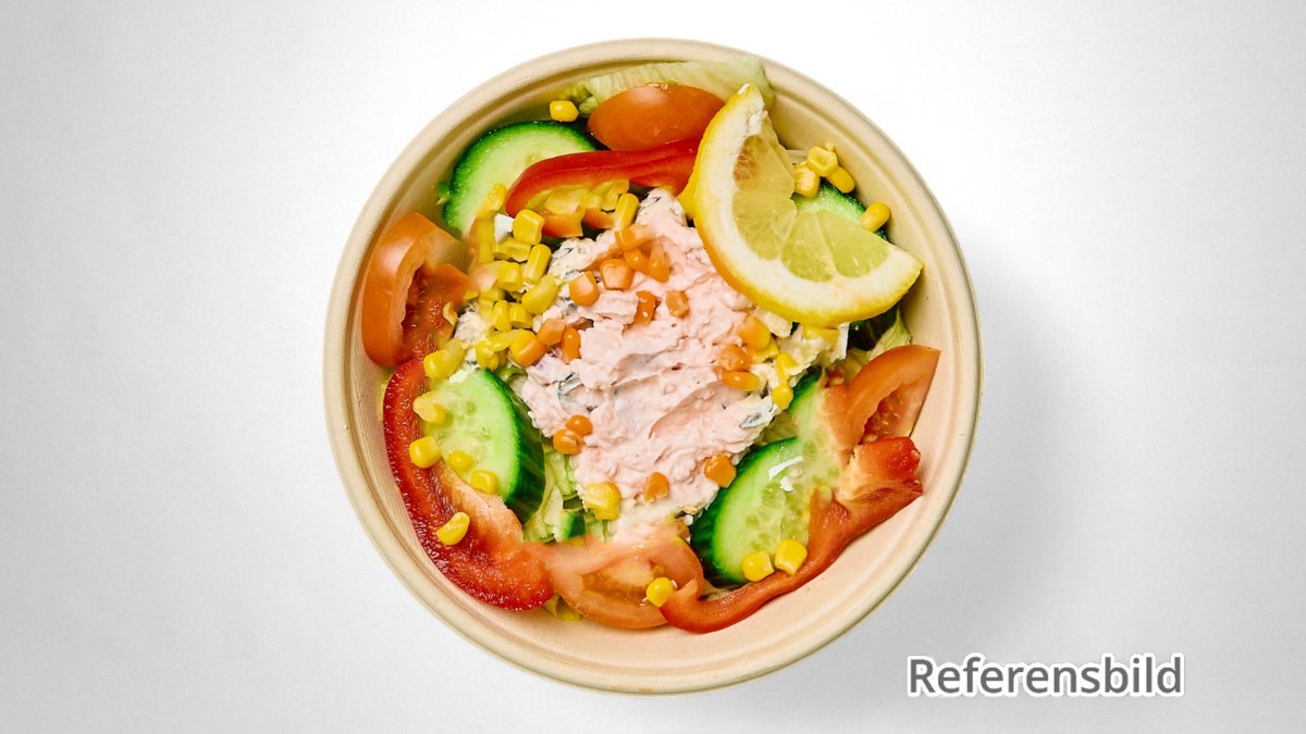 Tonfisk, isbergssallad, gurka, fetaost, tomat, paprika, oliver, ost, ananas och citron.