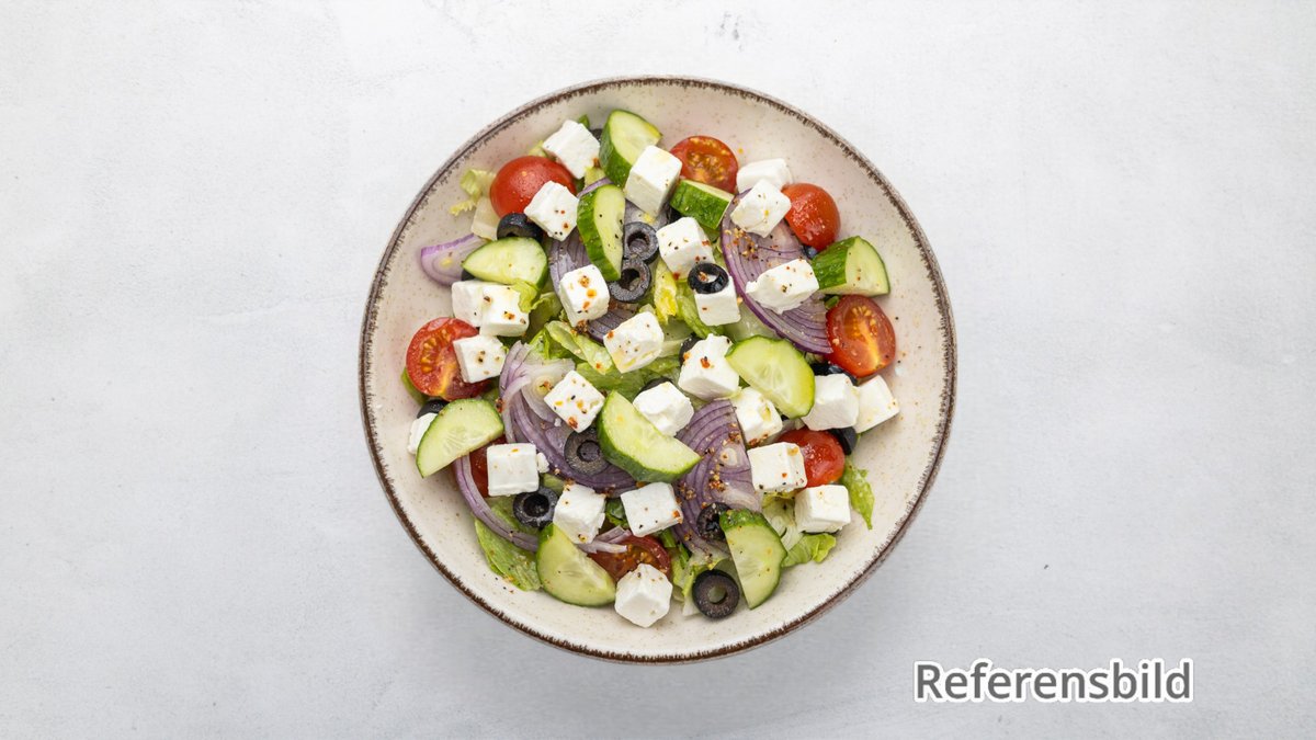 Isbergssallad, gurka, fetaost, tomat, paprika, oliver, ost, ananas och citron.
