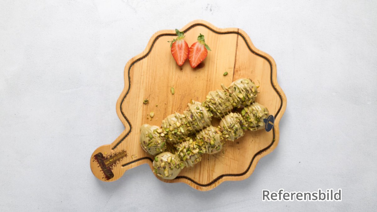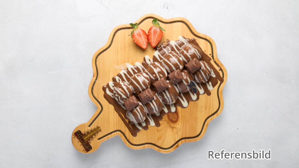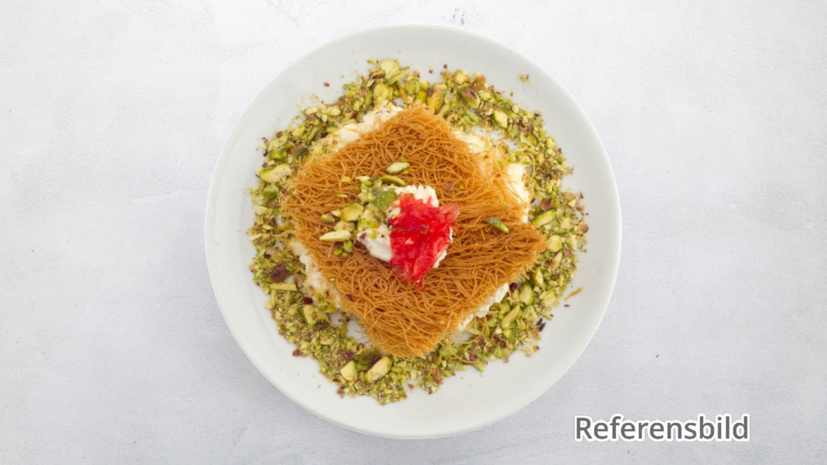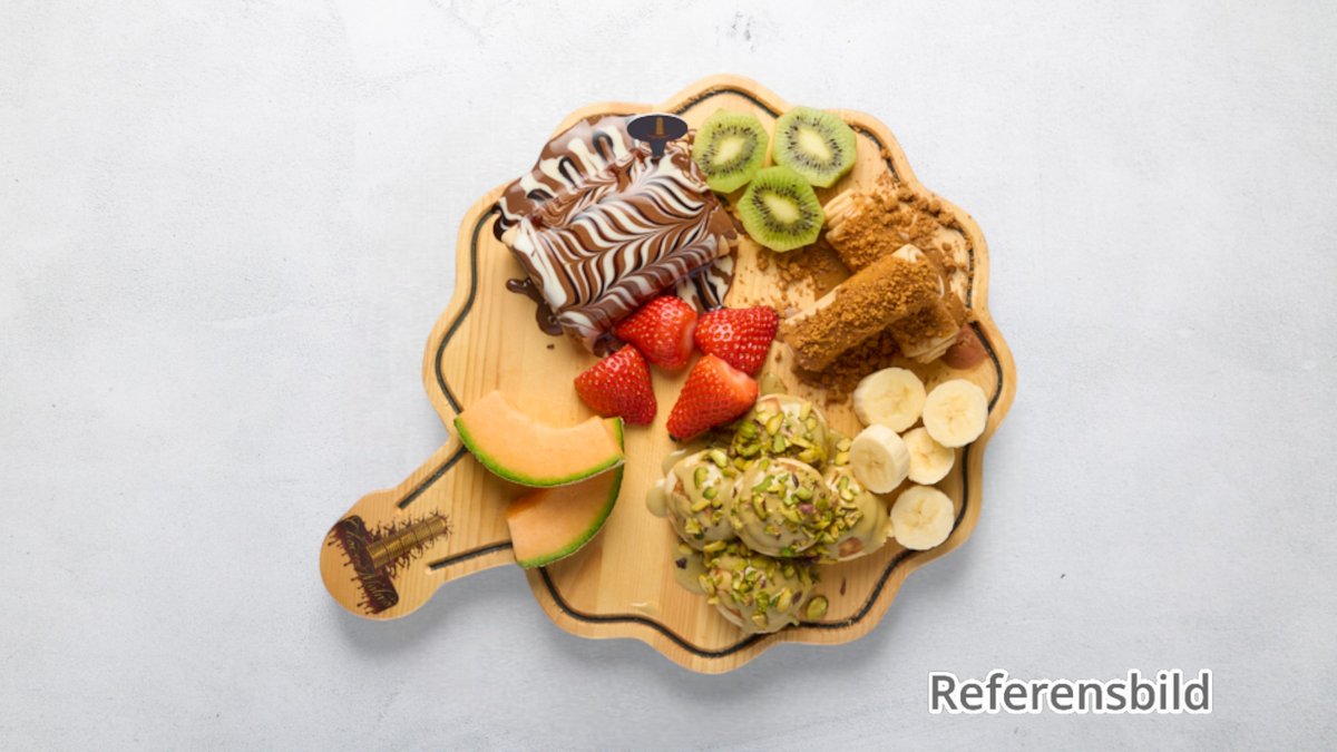 Serveras med frukt, kunaffa, pistasch, nutella och vitchoklad.