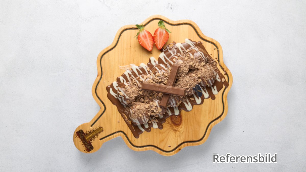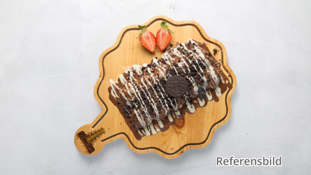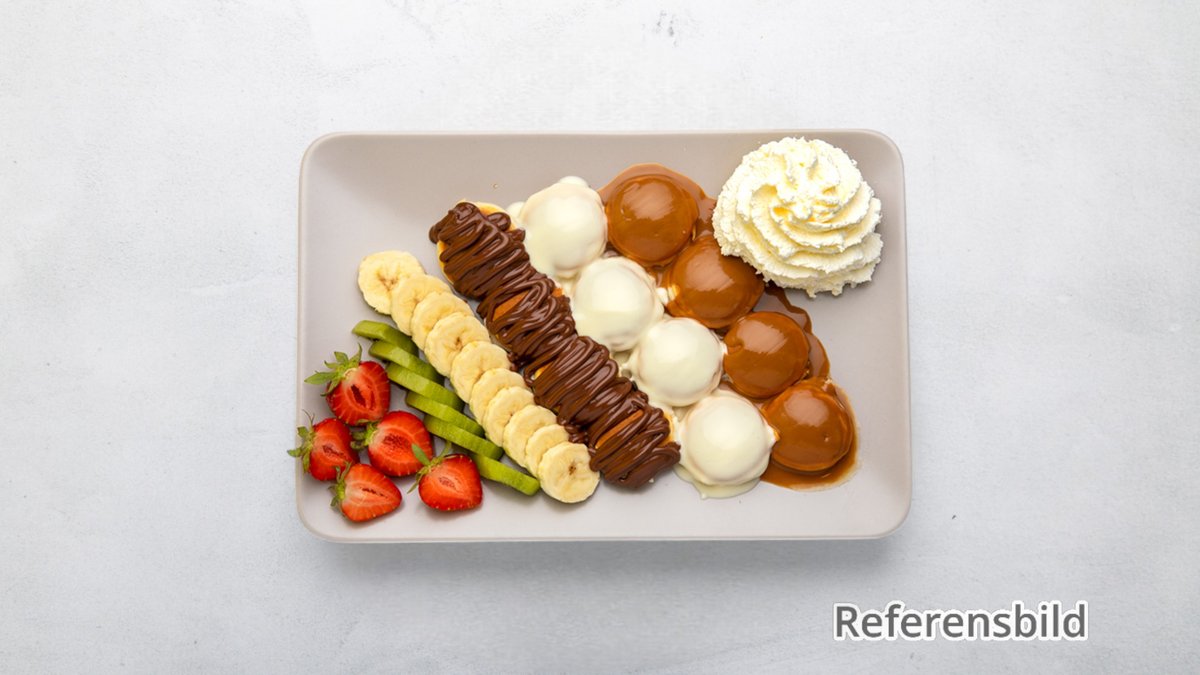 Serveras med nutella, vit choklad, oreo, pistage, lotus, frukt och glass.