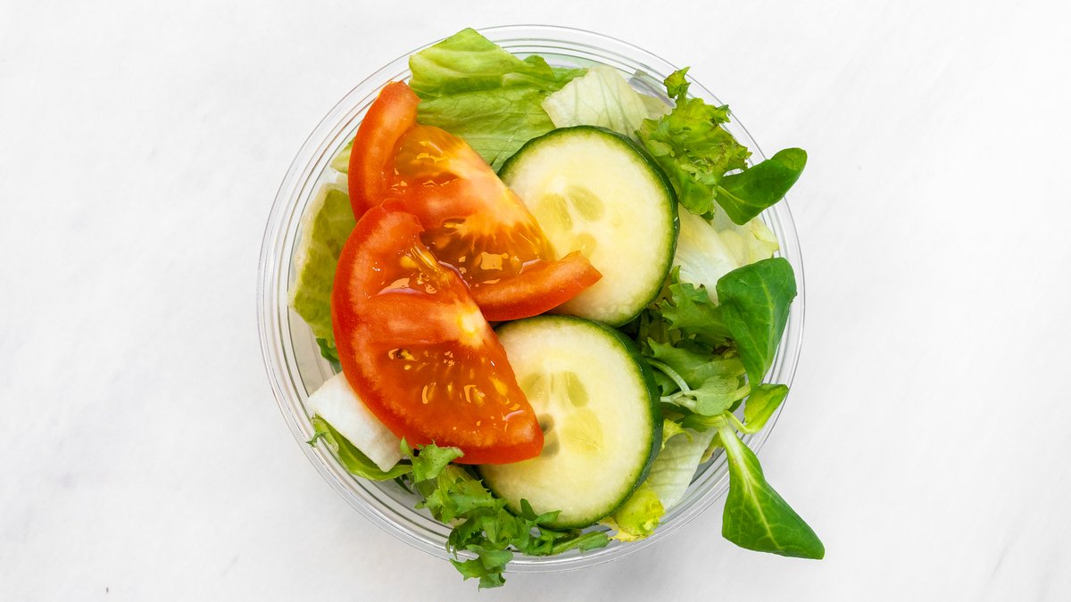 Klassisk grönsallad med mixsallad, gurka och körsbärstomat.