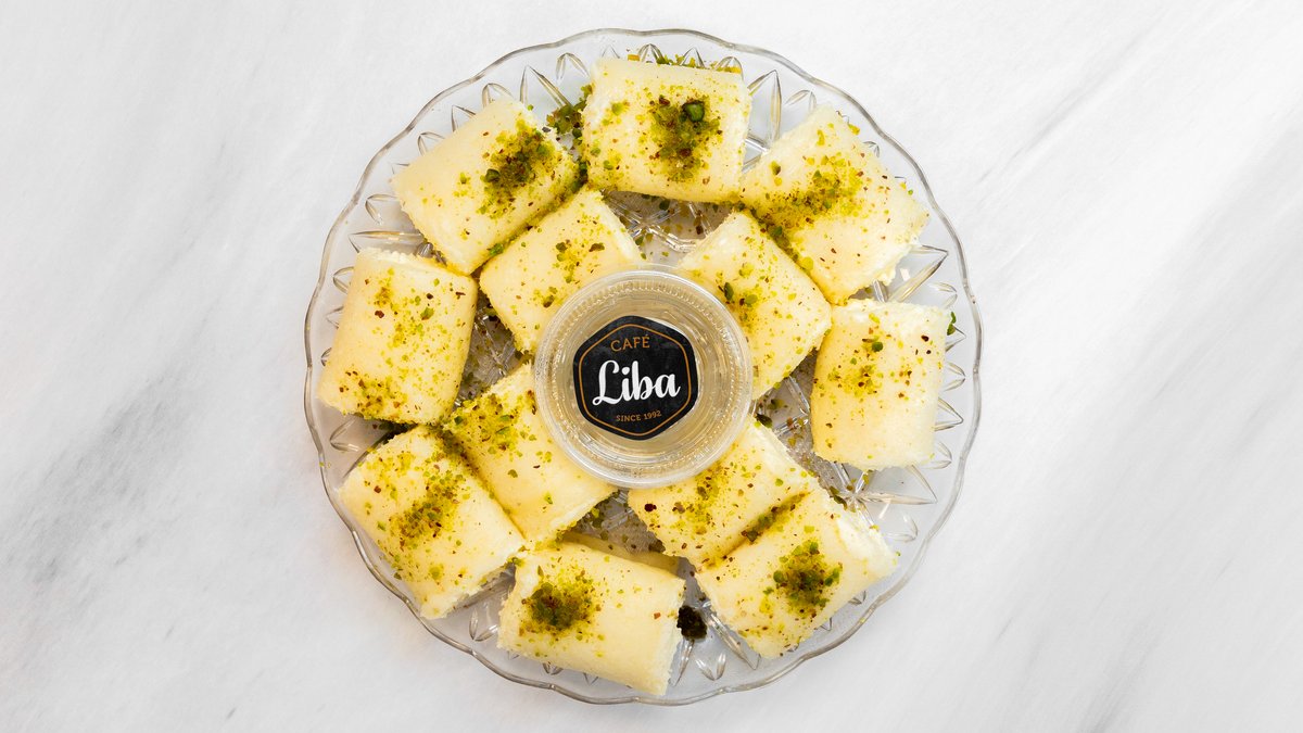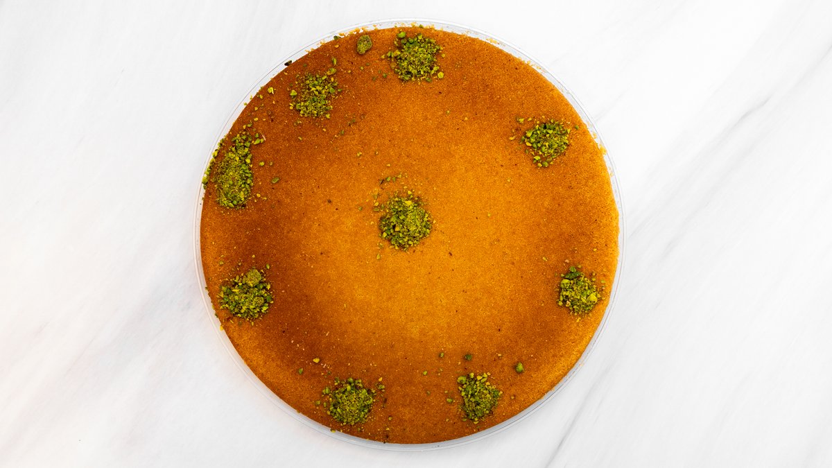 Orientalisk delikatess gjord på mannagryn och ostdeg. Fylld med tjock grädde och toppad med pistagenötter.