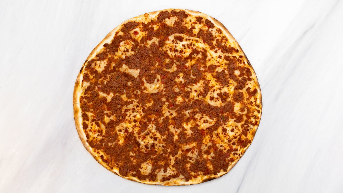 Traditionell libanesisk nötfärspizza bakad med finhackad lök, vitlök och tomatsås.