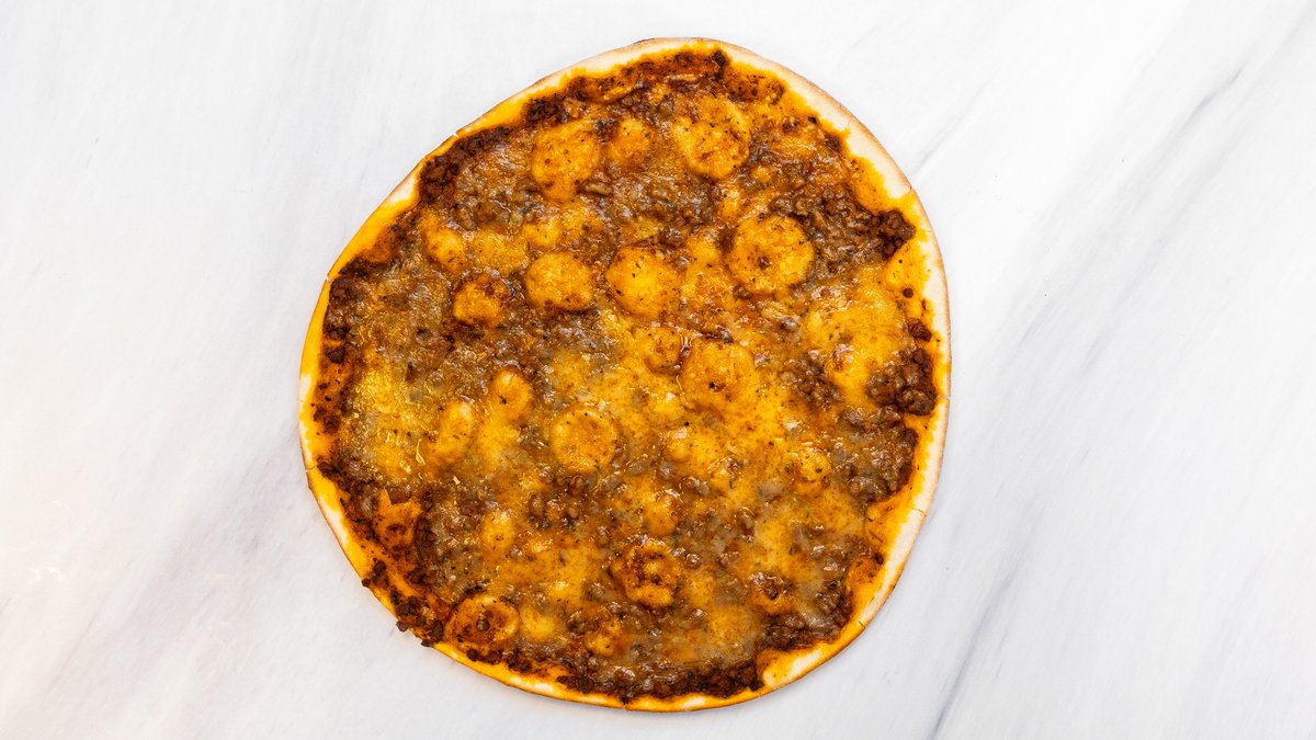 En smakfull och kryddig nötfärspizza med riven ost, finhackad lök och vår goda tomatsås.
