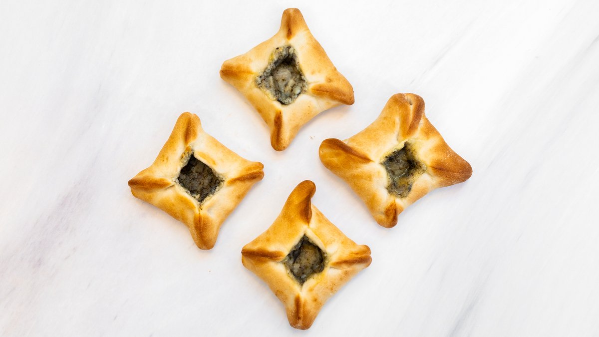 Triangelformad pirog fylld med spenat, finhackad lök, citron och vitlök.