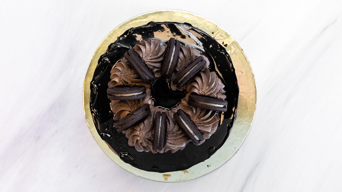 10 bitar: Chokladbotten med grädde, äkta vaniljkräm och chokladganache. Täckt med märk chokladglasyr och choklad praliner. Topping kan komma att variera.